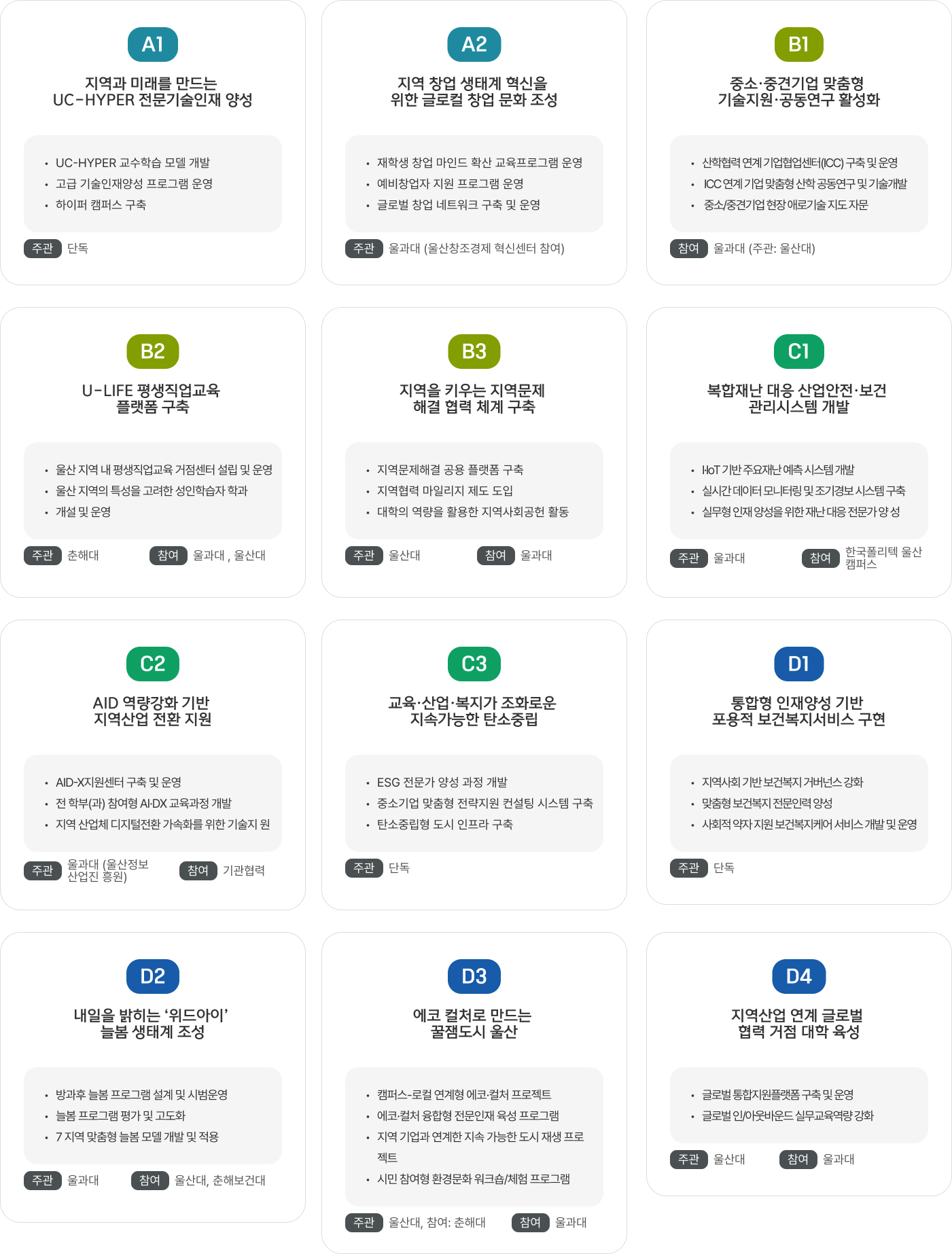 사업 및 프로그램 프로젝트 주요내용 메인으로 이동 사업 및 프로그램 기타 닫기 프로젝트 주요내용 프로젝트 주요내용 사업 추진 계획 단위과제 비전 및 목표 닫기 사업 및 프로그램 사업 및 프로그램 프로젝트 주요내용 사업 추진 계획 단위과제 비전 및 목표 A1 A2 B1 B2 B3 C1 C2 C3 D1 D2 D3 D4 SNS 목록열기 FACEBOOK 공유하기 TWITTER 공유하기 BLOG 공유하기 BAND 공유하기 GOOGLE+ 공유하기 SNS 목록닫기 인쇄 프로젝트/단위과제별 신청 주요내용